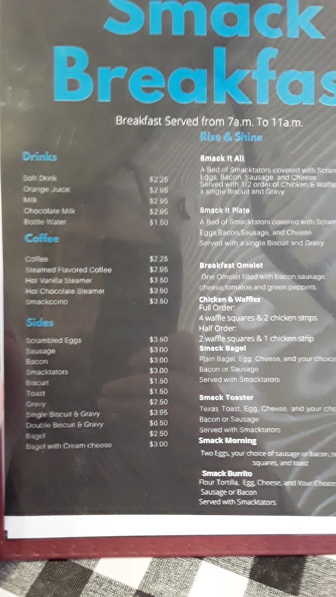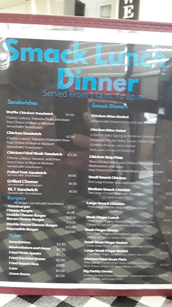 From a reviewer’s perspective, the menu at Smack That - Chouteau delivers a satisfying and well-rounded comfort-food experience that clearly reflects the restaurant’s identity. Whether visiting on Sunday or ordering from the all-day menu, diners are met with consistency and variety. Signature meals like The Weekender Fish Dinner and The Weekender Fish Lunch set the tone for hearty, no-nonsense plates, while classic options such as Steak Finger Dinner, Chicken Strip Dinner, Chicken Fried Steak Dinner, and Hamburger Steak Dinner reinforce the kitchen’s strength in homestyle cooking. Lunch portions, including Steak Finger Lunch and Chicken Strip Lunch, offer the same familiar flavors in a lighter format. The menu also shines in its range of handhelds and baskets, from Pulled Pork Sandwich and Ultimate BBQ Sandwich to crowd-pleasers like Chicken Fried Steak Sandwich, The Combat Club, and Chicken Bacon Ranch Wrap. Basket options such as Small Steak Finger Basket (3), Medium Chicken Strip Basket (2), Large Steak Finger Basket (5), Shrimp Basket, and Chicken Bite Basket make it easy to share or customize a meal. Appetizers under Let’s Get It Started, including Smack Down, Okie Okra, Bountiful Mushrooms (Fried Mushrooms), Zucchini Fries, and Smack It Hot (Jalapeño Poppers), round out the experience with familiar bar-style favorites. For comfort classics with a twist, Chicken & Waffles, Walnut Chicken Salad, and Chicken Or Shrimp Fettuccine Alfredo stand out among Smack Favorites. Families are well covered with the Smackeroo’s Menu, featuring kid-friendly picks like Kids Chicken Bites, Kids Grilled Cheese, Kids Steak Fingers, Kids Chicken Strip, and Kids Cheeseburger Sliders (2), while seniors can appreciate the thoughtfully portioned Golden Years Menu. Finally, desserts such as Fried Pies, Cake Slice, and Cup Cakes, along with made-to-order Cakes and Cup Cakes, provide a comforting finish. Overall, the menu feels complete, approachable, and designed to please a wide range of appetites, making Smack That - Chouteau a reliable stop for classic American comfort food.